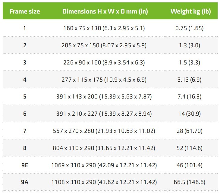 | Size 5 - 9: -20°C to 40°C (-4°F to 104°F) @ 3 kHz switching freq. | Operation to 55°C (131°F) with de-rating | |